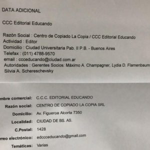 La Editorial CCC “Educando” es una empresa en toda regla: su nombre formal es Centro de Copiado La Copia y es una Sociedad de Responsabilidad Limitada. Pero no termina ahí: en la documentación que nos proporcionaron los estudiantes del MLI se encuentra una copia de una de las actas de dicha empresa donde figura más información: en el año 2009 el capital que la empresa declaraba equivalía a US$ 50.000 dólares y, lo más curioso y preocupante es que el domicilio de constitución de la empresa declarado ante la IGJ, es un local de la misma en el Pabellón 2 de la Ciudad Universitaria, es decir, en la sede de la Facultad de Ciencias Exactas y Naturales de la UBA.